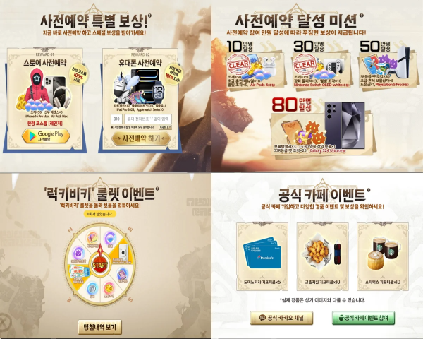 이러한 보상은 게임을 시작할 때 큰 도움이 될 것입니다. 사전예약은 달성 미션에 따른 보상혜택과 '럭키비키 룰렛 이벤트', 공식 카페 이벤트 혜택도 사전예약하고 받아 보세요.