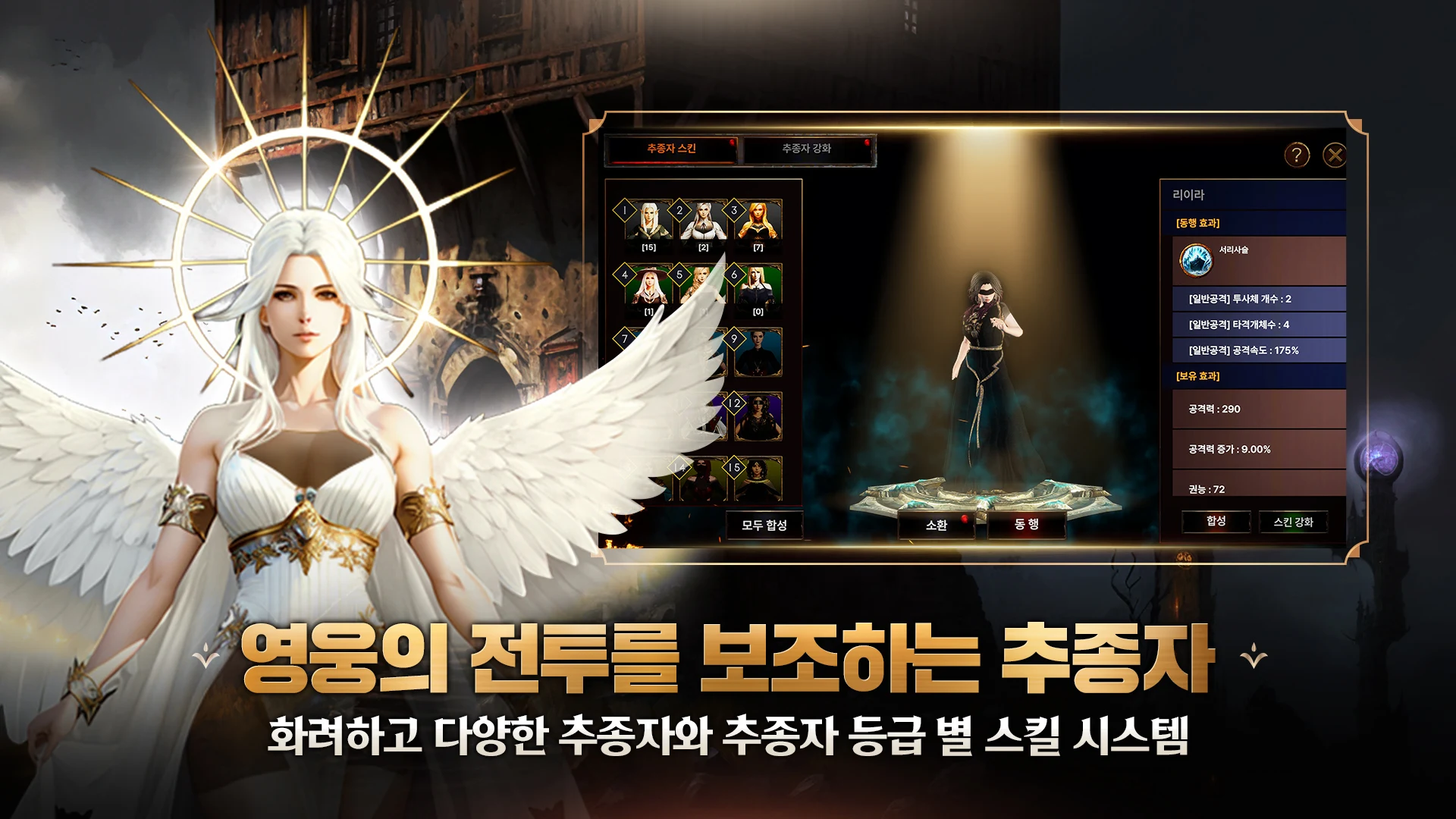 다크판타지 핵 앤 슬래시 방치형 RPG입니다. 각 스테이즈를 균열 스테이지를 통한 끝없는 장비 파밍을 할 수 있는 시스템입니다. 그리고 듀얼 웨폰 시스템을 통한 나만의 전투 스타일 구축이 가능합니다. 무기 종류에 따라 사용하는 스킬이 다르며, 전투 스타일을 달라 진다는 점입니다. 또한 영웅 특성 강화를 통해 전략적 강화 시스템을 할 수 있습니다. 스킬 특성 개방을 통한 스킬 강화와 다양한 전투 콘텐츠를 통한 육성 그리고 다양하고 화려한 추종자 스킨과 추종자 등급 별 스킬 시스템을 잦추고 있습니다.