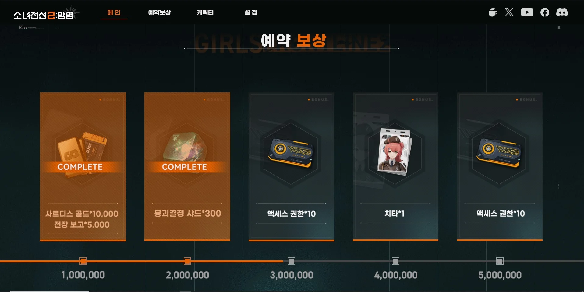 사전예약에 참여하는 유저들은 다양한 보상을 기대할 수 있습니다. 현재 목표는 총 5,000,000명의 예약이며, 이 목표에 도달할 경우 각종 보상이 주어집니다. 예약보상 목록에는 1,000,000명 달성 시 10,000 골드와 5,000 전장 보고서를, 2,000,000명 달성 시 300개의 붕괴결정 샤드, 3,000,000명 달성 시 10장의 액세스 권한 카드와 4,000,000명 달성 시 치타 캐릭터를 특별 아이템을 지급합니다.