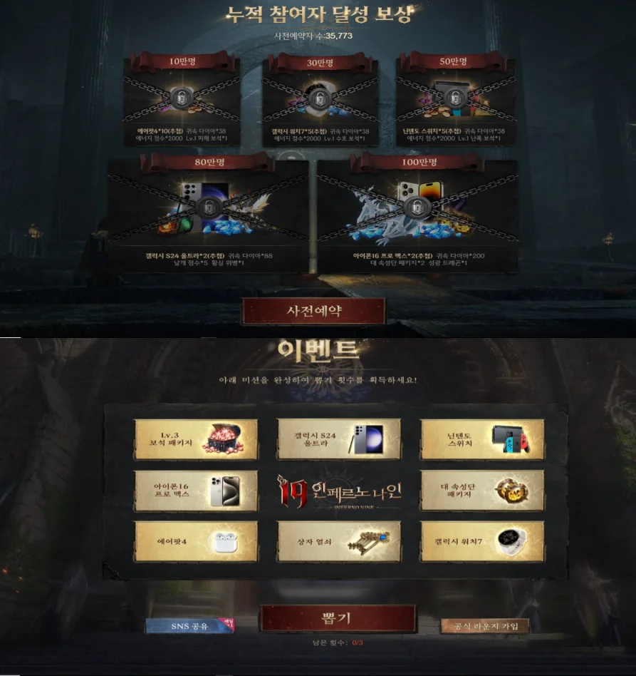 또한, 참여자 수에 따라 추가 보상도 준비되어 있어, 사전예약에 참여하는 것이 더욱 중요해졌습니다. 10,000명, 30,000명, 50,000명 등 다양한 목표 인원이 설정되어 있으며, 각 목표 달성 시 추가 보상이 지급됩니다.